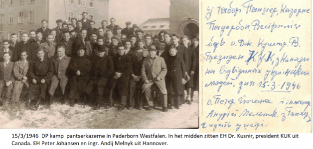 Bezoek in het kamp van Paderborn. Op 15/3/1946 worden de vluchtelingen bezocht door de president van een Oekraïens-Canadese ngo, de EH Dr. Kusnir, en door de EH Peter Johannes, en tevens door de politieke leider van de Oekraïense regering in ballingschap ingr. Andriy Melnyk.
